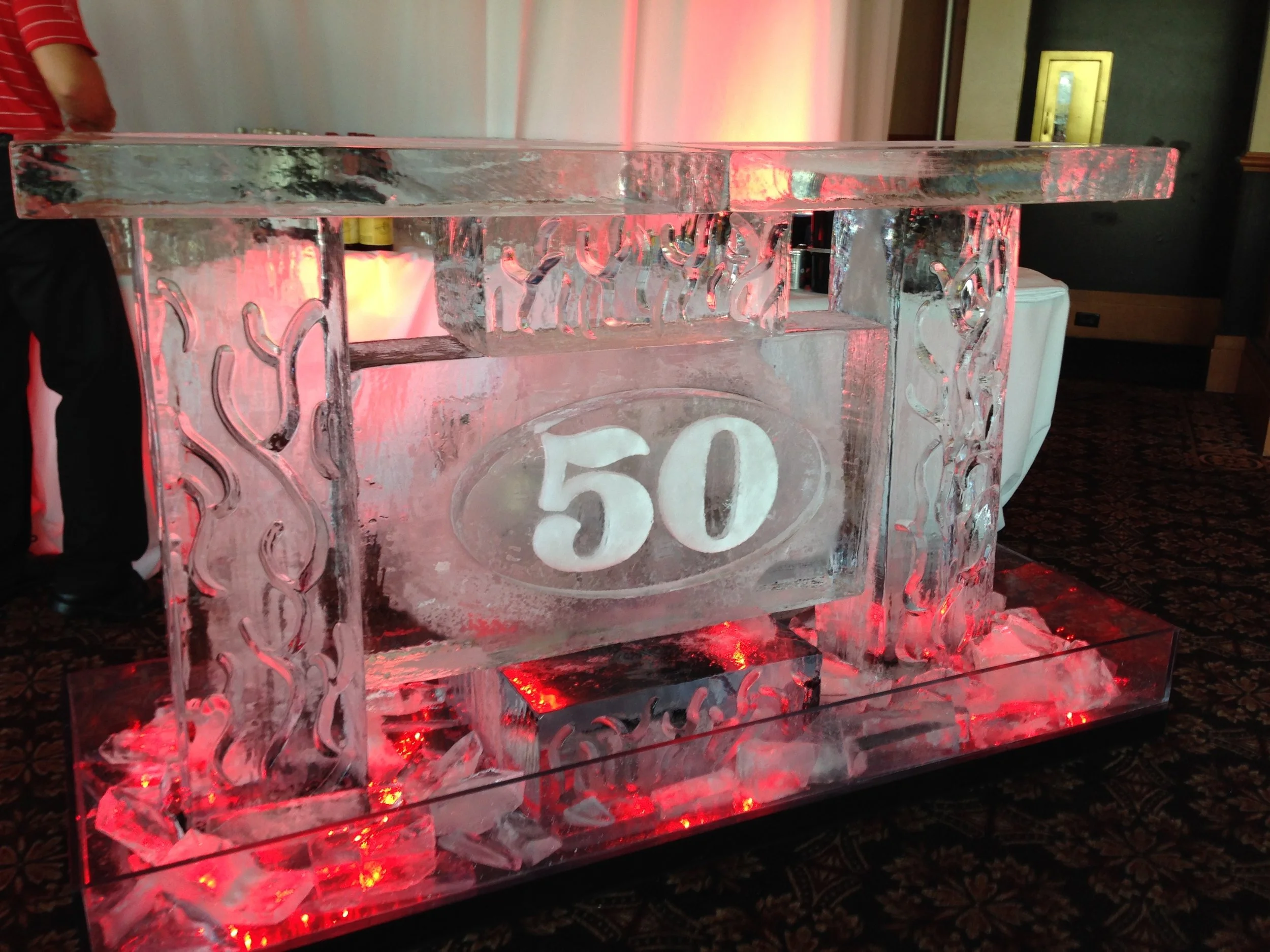 Ice bars start at six feet long and 20 inches wide. We can make the bars much longer or in any shape. Logos can be added to the front of the bar. Drink luges can be added to the top of the bar. Bottle chillers can be added on the bar or as a back bar.